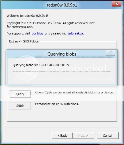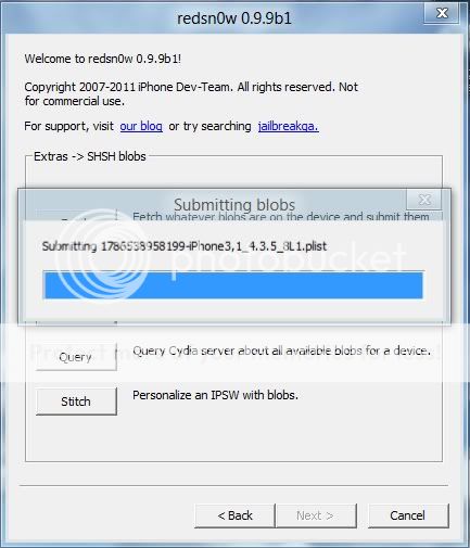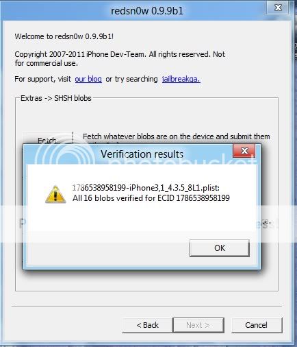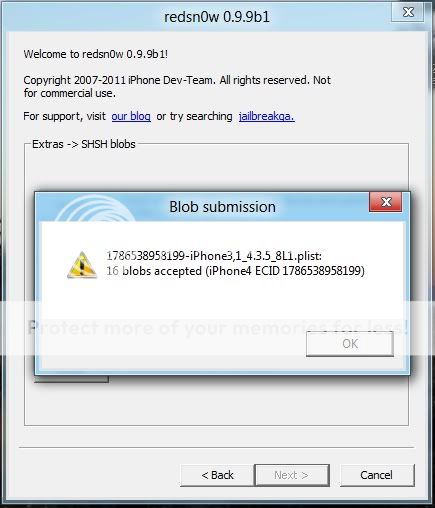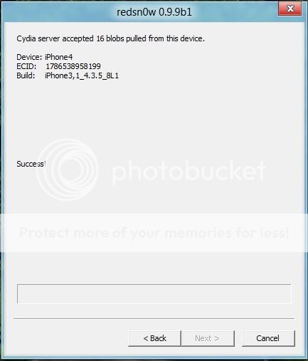 Redsnow sẽ tiến hành kiểm tra và gửi file shsh blosg lên cydia, thành công sẽ báo hình dưới đây