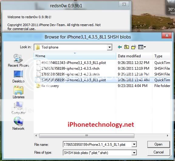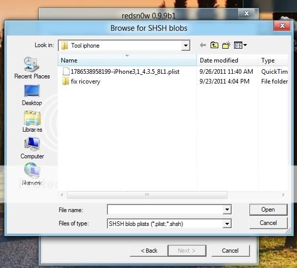 sẽ hiện ra 1 cửa sổ nơi chứa shsh blosg lấy về ( chính là file .plist , file này nằm cùng thư mục bạn chạy redsnow ). Bấm chọn file đó